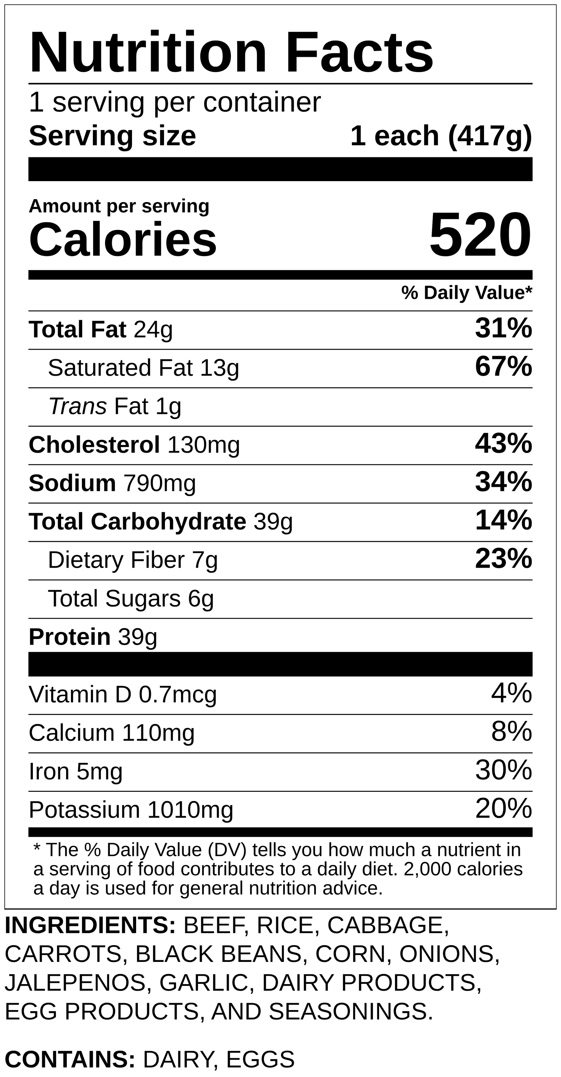 Beef, Rice, Cabbage, Carrots, Corn, Beans, Onions, Tomatoes, Jalepeno, Cilantro, Chipotle Pepper, Sour Cream, Mayonnaise, Lemon, Lime, Spices, Salt.