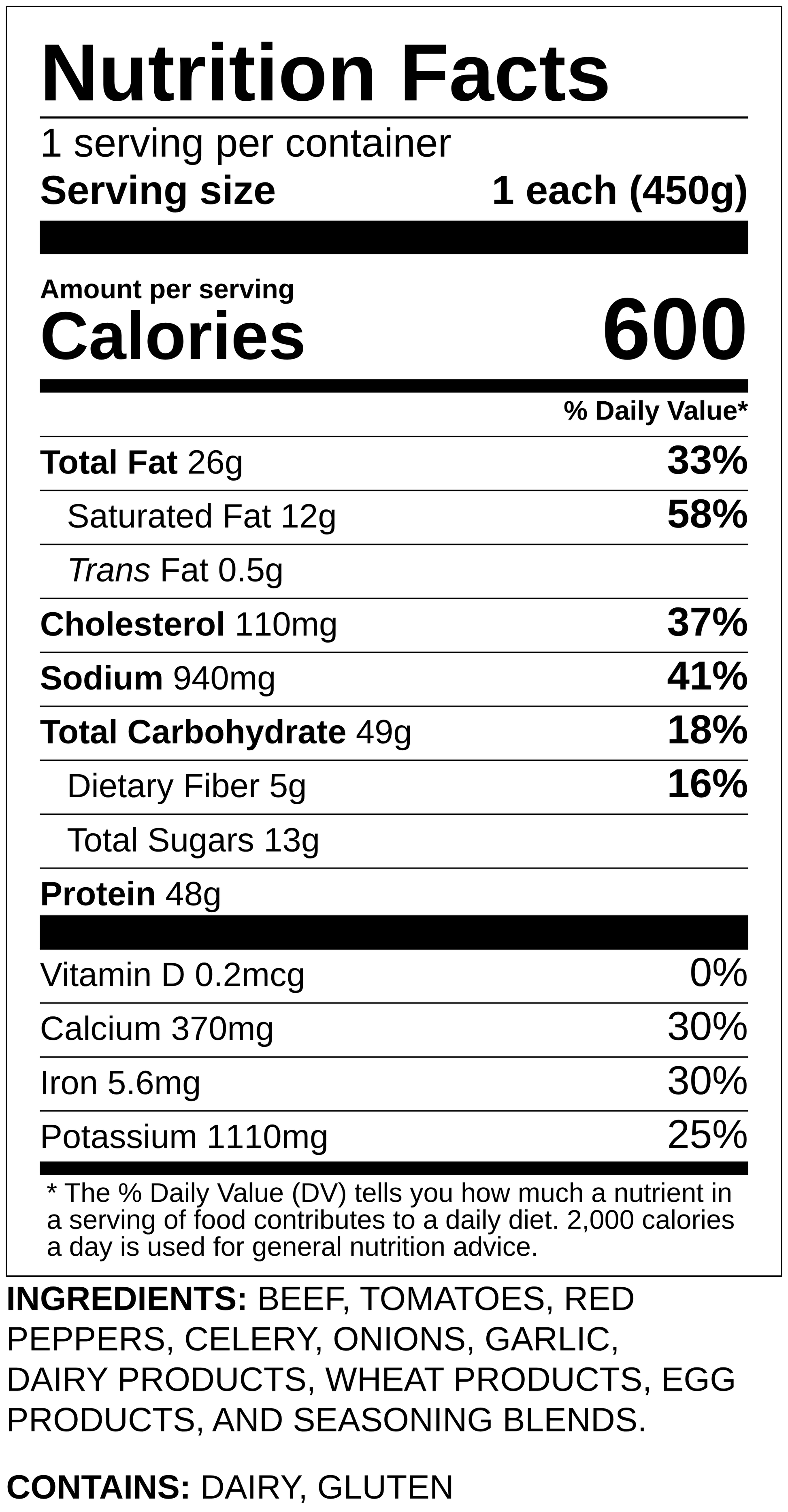 Beef, Tomatoes, Spinach, Peppers, Onion, Celery, Cheese, Garlic, Wheat products, Spices, Salt.